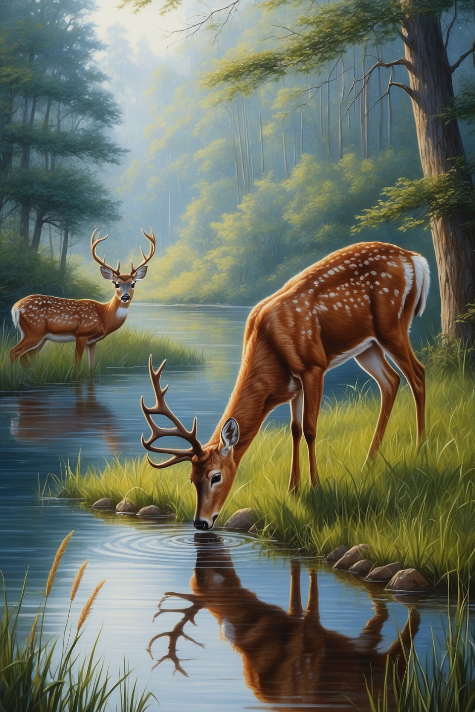 Immerse yourself in the tranquility of nature with this serene scene: two majestic deer gracefully sipping from a gentle stream. Let the peacefulness of this moment wash over you, offering solace and respite from life's hectic pace.