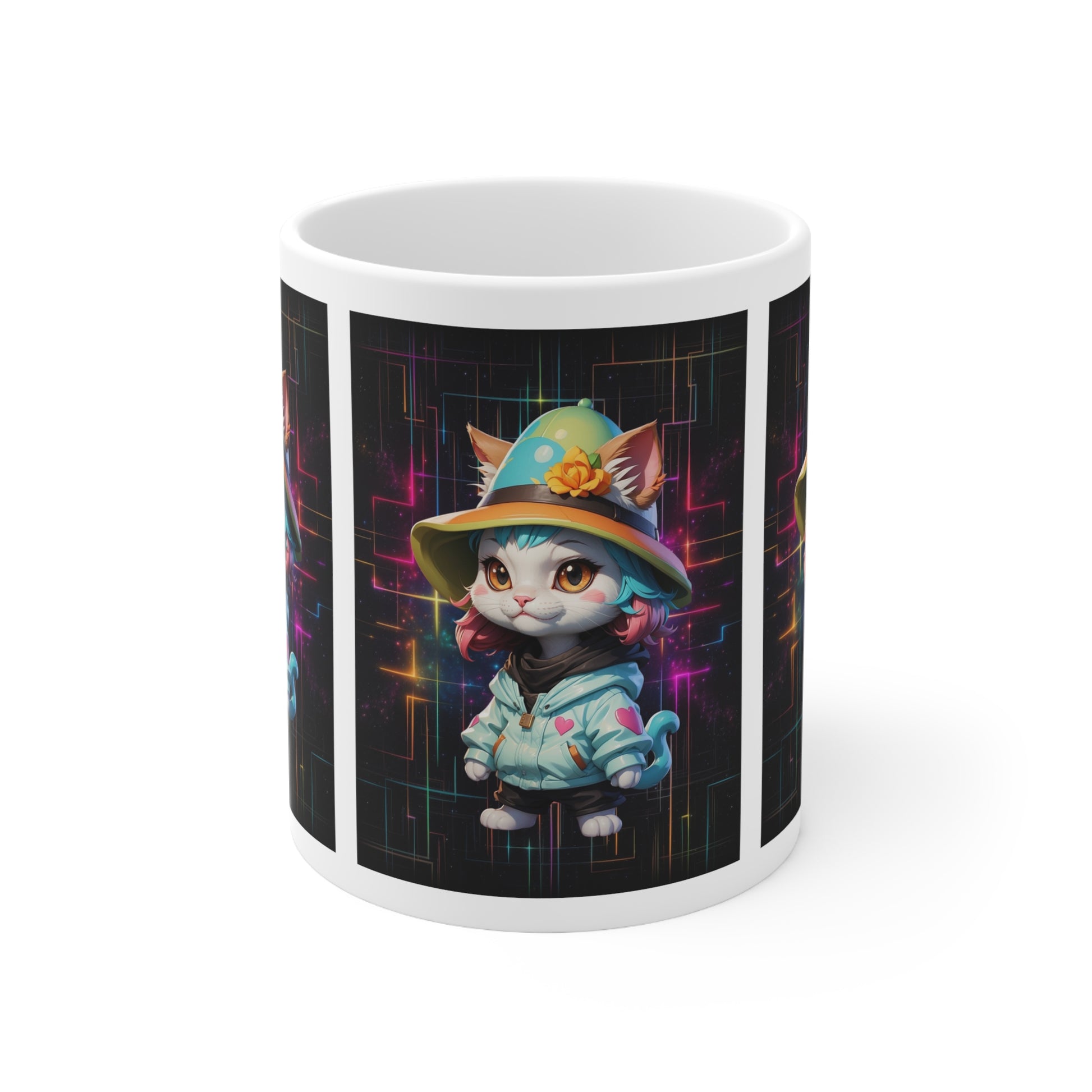 Ceramic coffee mug."Kittycore" print. It's BPA and Lead-free, and also safe for microwaves & dishwashers. It's made of black, durable ceramic in an 11-ounce size. It's the perfect gift for people who love coffee, tea, and chocolate. If you like this design check out our matching t-shirt! .: white ceramic .: 11 oz (0.33 l) .: Rounded corners .: C-handle .: Lead and BPA-free. If you like this design check out our matching shirt!